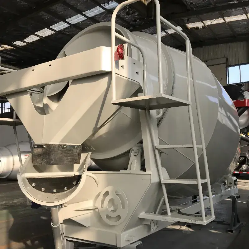 The container for loading concrete is the core component of the mixer truck, made of high-strength steel plates, with double spiral blades welded on the inner wall, in a conical or pear shaped structure, used for mixing concrete during transportation.